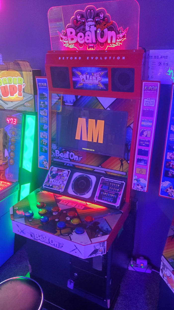 to my surprise the arcade had TWO pump cabs, but i didn't hop on them because something else they had caught my attention even more... they had a HAND PUMP cab too. it's exactly what it sounds like, pump it up except for your hands, the same 10-panel pad layout recreated with little circular buttons, although the cab is technically called "BeatOn" it runs on the exact same pump it up software, just a locked-down version without networking capabilities so that hand players don't mess up the global high scores. the cabs are almost impossible to find outside of korea, usually people just build their own setups for hand pump, and it seems they're pretty rare in korea now too since it's no longer being updated. i sat down and immediately put a thousand wonnies into the cab... i got the hang of it fast, pretending like my hands were my feet and alternating them to hit notes like i would normally while reading a pump chart, the one issue is that the cab had this bizarre visual glitch that made the notes flicker constantly. still, i was good enough that i could play through it, and i texted the cable car crew to meet me in the arcade when they made it up.